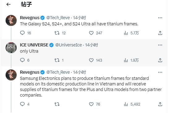 消息源 @Tech_Reve 今天发布推文,表示三星 Galaxy S24、Galaxy S24+ 和 Galaxy S24 Ultra 三款手机均采用钛合金中框。