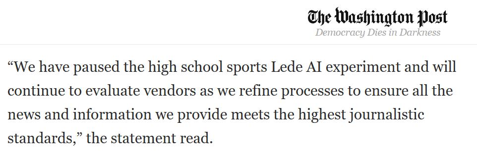 我们已经暂停了高中体育 Lede AI 实验,并将继续评估供应商,我们正在改进了流程,以确保我们提供的所有新闻和信息都符合最高的新闻标准。