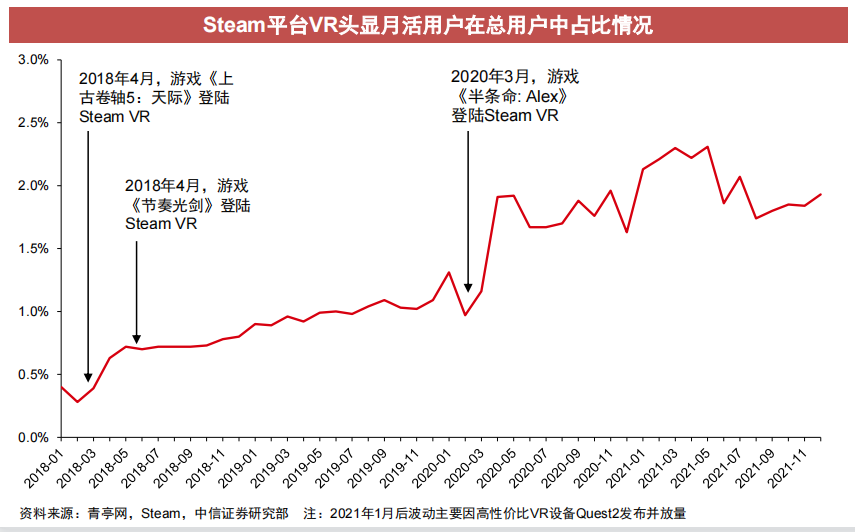 不过,据青亭网数据显示,截止2022年4月,Steam VR内容数量最多,共有6,464款游戏与应用。而同期Oculus、SideQuest、APP Lab内容数量分别为1,738款、3,052款、1,074款。此外,Steam平台通过高质量的VR内容持续吸引用户流量。