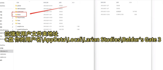 3、玩家使用的mod需要放置在本地mods的文件夹中,位置在C:/Users/用户名/AppData/Local/Larian Studios/Baldur's Gate 3/Mods。