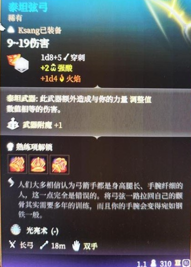 2.前期最强远程武器,伤害加伤力量调整值,大家都知道力量可以靠德鲁伊营地老婆婆卖的巨人灵药达到21,相当于5调整值,也就是加了固定5点伤害,这把弓伤害变成