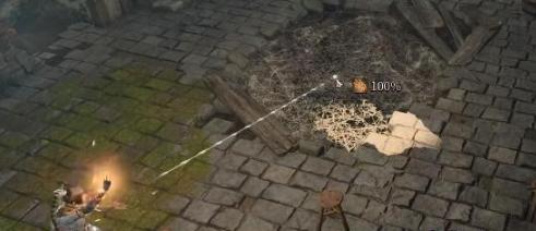 3、找到被蛛网覆盖安全通道后,操纵人物角色应用专业技能【火焰箭】将蛛网损坏,进而开启通向【别墅地下室】通道。