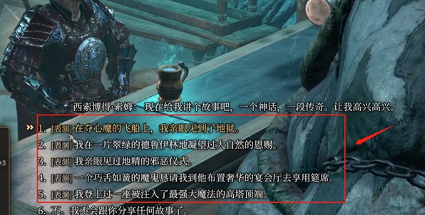 3、喝完酒之后他会要求我们讲故事,此时不要选择最下面的拒绝选项即可,选择完毕后会进行一次魅力检定。
