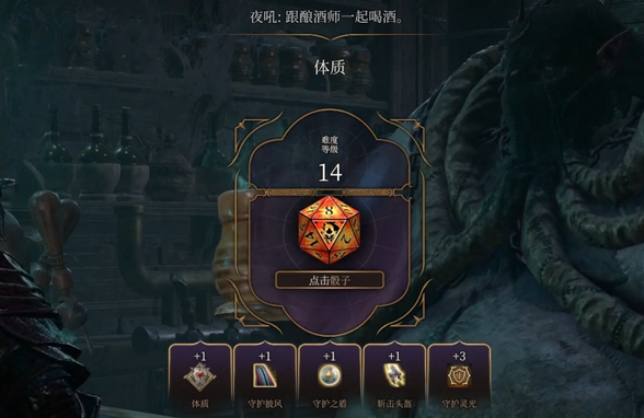 1、玩家最好选择一个魅力和体质属性比较高的角色去和大酒桶喝酒,喝酒的过程中有多次检定。