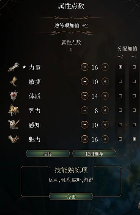 属性加点主要通过力量与魅力,根据下图进行加点即可。