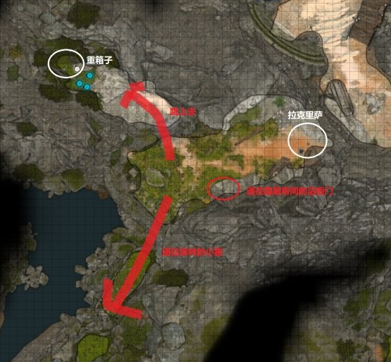 高台左边跳上去有一个重箱子,南方跳过去则是一条通向森林的小路。