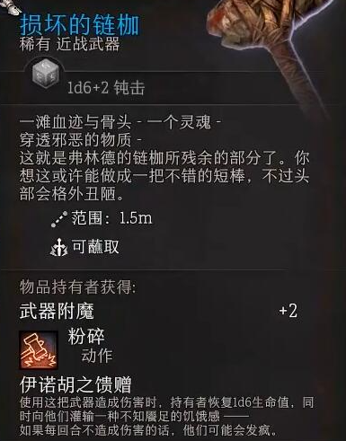 1、损坏的连枷:1d6+2钝击,单手近战连枷,造成伤害时获得1d6hp,同时如果每回合不造成伤害则有可能发疯。
