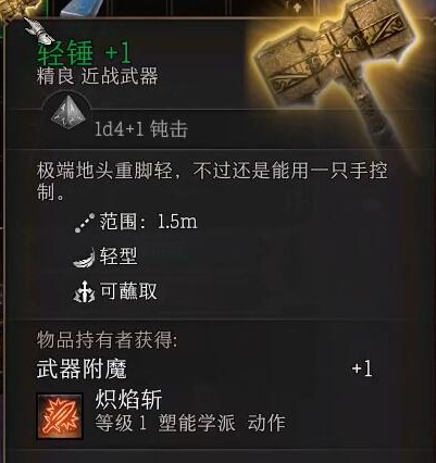 1、轻锤+1:持有者可以获得武器附魔+1,炽焰斩法术。