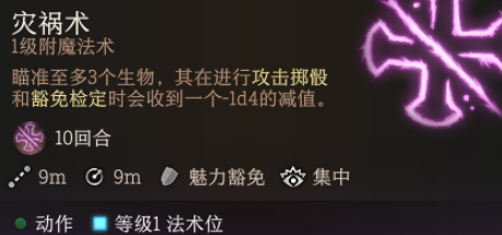 5、灾祸术,一级附魔法术,被灾祸术击中的玩家会受到1d4的攻击投掷和豁免检定减值。