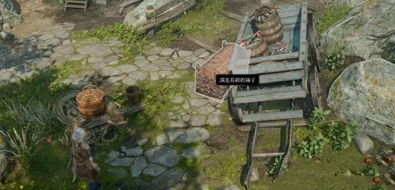 1.玩家首先来到染疫村落,找到装着木桶的板车,如下图所示位置。