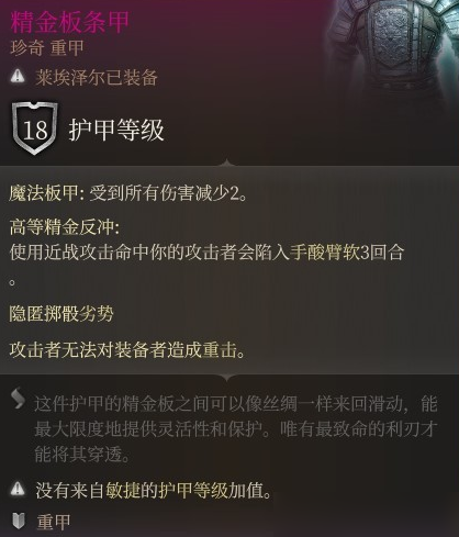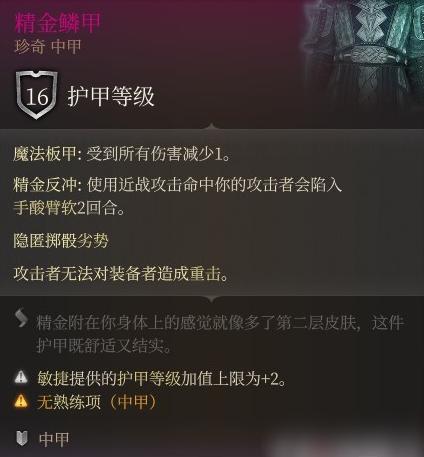 博德之门3精金装备上面综合属性数值来看,精金鳞甲比较好鳞甲是博德之门3游戏中高等级的精金装备,属于稀有装备,需要高经验值获得,防御值高,能够保护角色不受伤害,而且与重甲相比还有敏捷加成,受到非常多玩家的喜爱。