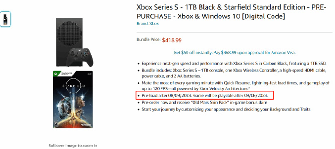 根据美国亚马逊的星空版 Xbox Series S(1TB,黑色)商品信息,玩家可以从8月9日起开启星空的数字版预载,PC 版预载时间未公布,购买高级版可抢先5天体验游戏。