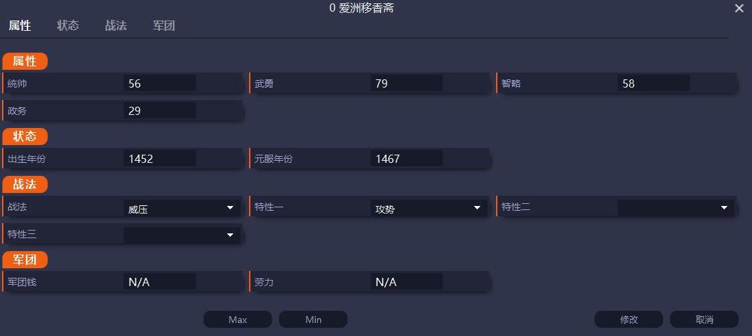 3.打开修改项面板后,玩家可以在【军团】栏目下对当前武将所在军团进行数值修改。