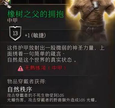 1、橡树之父的拥抱:13护甲中甲,攻击穿戴者的不死生物额外受到1d6光耀,攻击穿戴者的野兽额外造成1d6光耀。